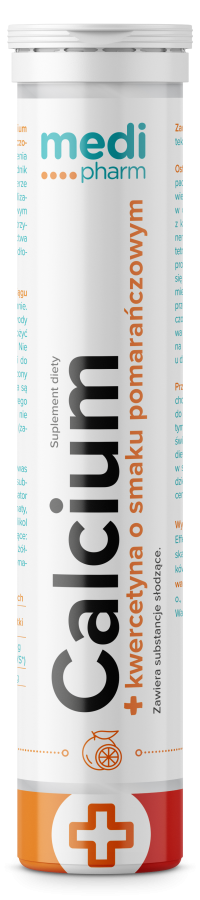 Suplement diety medi pharm Calcium z kwercetyną o smaku pomarańczowym polecany jest w celu uzupełnienia diety w wapń i kwercetynę – składnik pochodzenia roślinnego. Wapń bierze udział w procesie podziału i specjalizacji komórek. Pomaga w prawidłowym funkcjonowaniu mięśni oraz w utrzymaniu prawidłowego przekaźnictwa nerwowego. Przyczynia się do prawidłowego krzepnięcia krwi.