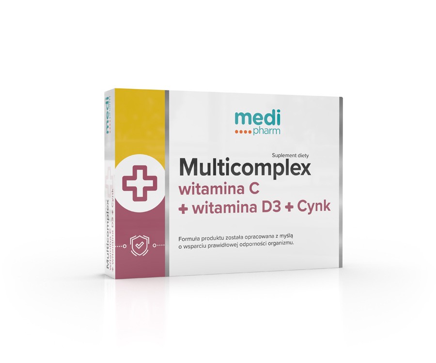 Suplement diety Multicomplex witamina C + witamina D3 + Cynk to suplement diety zawierający 1000mg witaminy C, której działanie wspierają dodatkowo witamina D i cynk. Formuła produktu została opracowana z myślą o wsparciu prawidłowej odporności organizmu, dzięki zawartości wysokiej ilości witaminy C, witaminy D i cynku. Dodatkowo cynk i witamina C stanowią ochronę komórek przed stresem oksydacyjnym. Witamina C pomaga również w prawidłowym funkcjonowaniu układu nerwowego oraz wspiera prawidłowe funkcje psychologiczne. Przyczynia się do zmniejszenia uczucia zmęczenia i znużenia. Witamina D w połączeniu z cynkiem pomagają w utrzymaniu zdrowych kości i zębów. Cynk jest składnikiem wspierającym prawidłowy metabolizm m.in. węglowodanów, kwasów tłuszczowych i witaminy A. Bierze również udział w syntezie białka.